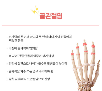 - 주로 무릎, 엉덩이, 손가락, 척추 관절 등 체중 부하 부위에 발생