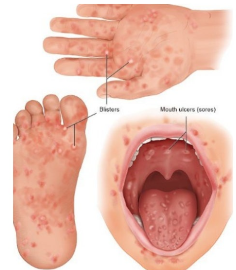 원인: 콕사키바이러스(A16형) 또는 엔테로바이러스(71형) 감염. 전염성 높음.